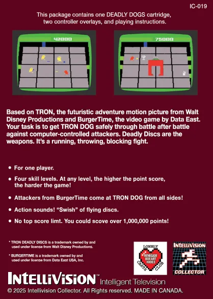 Based on TRON, the futuristic adventure motion picture from Walt Disney Productions and BurgerTime, the video game by Data East. Your task is to get TRON DOG safely through battle after battle against computer-controlled attackers. Deadly Discs are the weapons. It’s a running, throwing, blocking fight.
